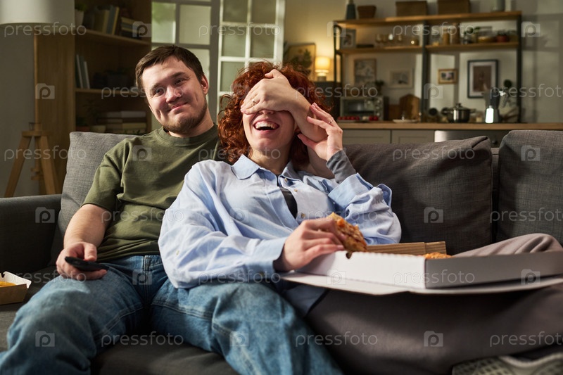 Молодой человек закрывает глаза рыжеволосой молодой женщине, которая ест пиццу