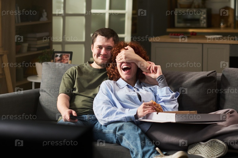 Молодой человек закрывает глаза молодой женщине, пока смотрит телевизор