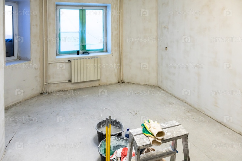 Верхний вид инструментов штукатурки в бетонной комнате