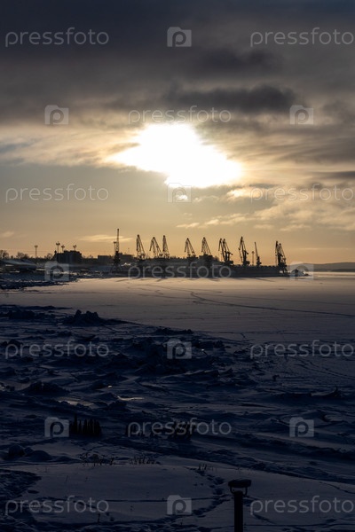 Замерзшее морское побережье и портовые краны в Кандалакше