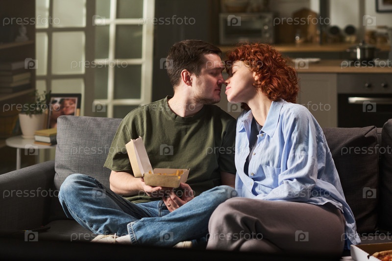 Молодой мужчина и молодая женщина делятся романтическими моментами в помещении