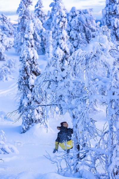 tourist between frozen trees on snowy hill Турист между замороженными деревьями на снежном холме