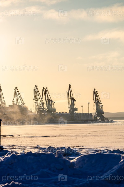 Замороженное побережье и краны в порту Кандалакши