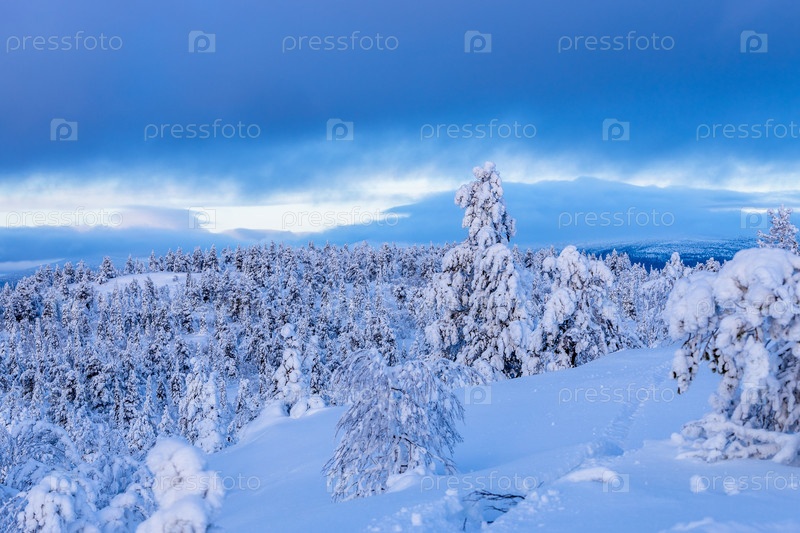 Вид на снежный лес на холме в зимний сумерки