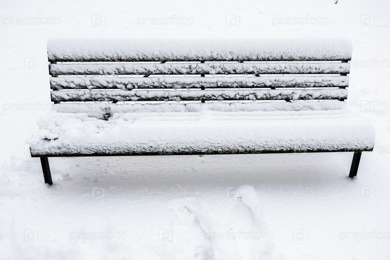 Вид на покрытую снегом деревянную скамейку в городском саду
