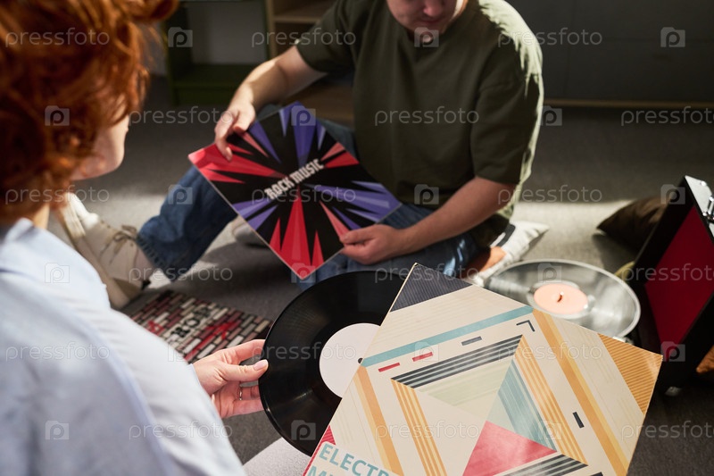 Молодой мужчина и женщина выбирают виниловые пластинки и слушают музыку в помещении