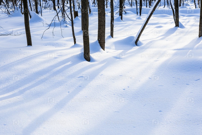 Синие тени деревьев на поверхности снежных заносов