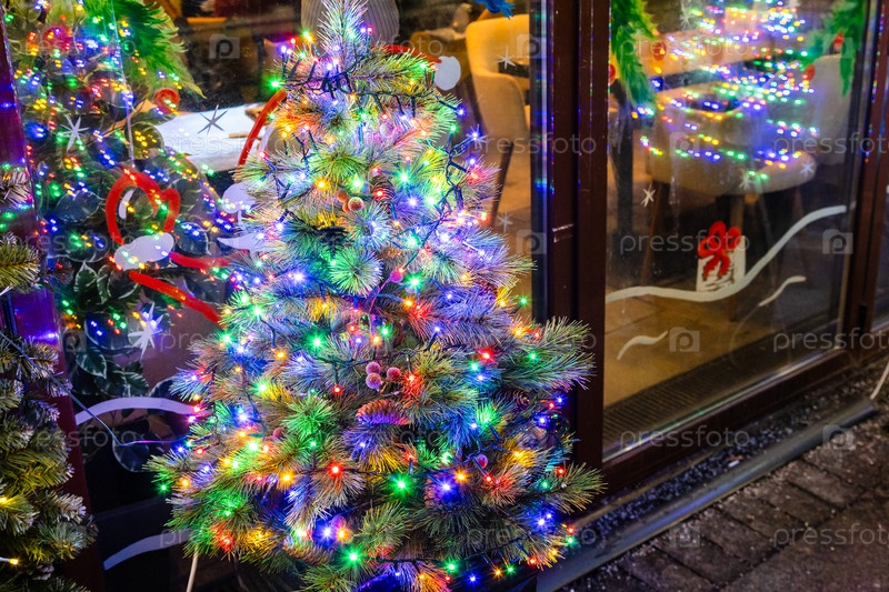 Красочная рождественская елка с гирляндами на улице