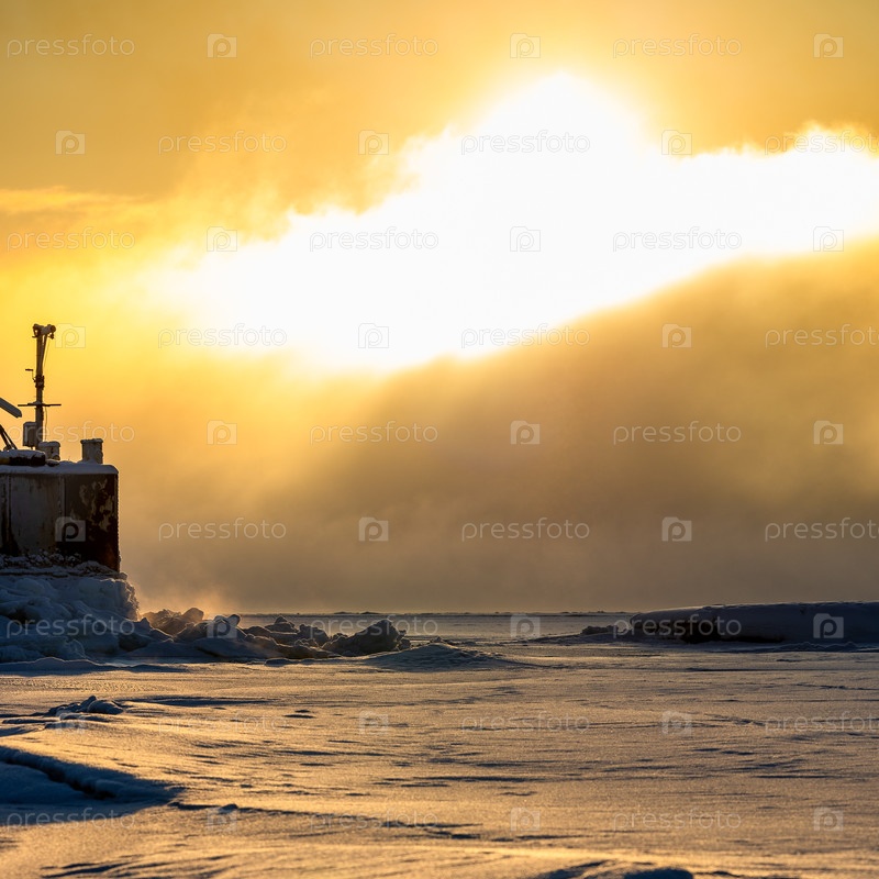 Восходящее солнце над снежным заливом Кандалакша зимой