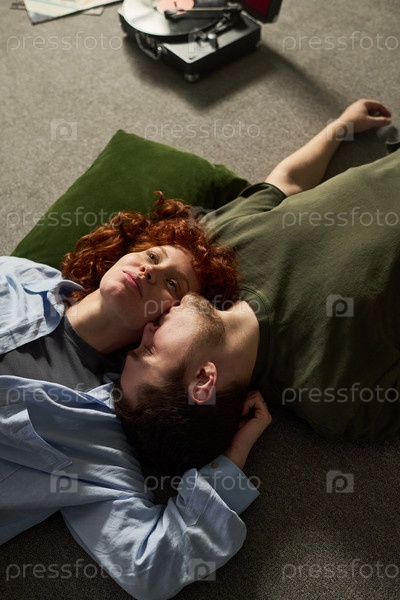 Молодая пара отдыхает вместе на полу, слушая виниловую пластинку