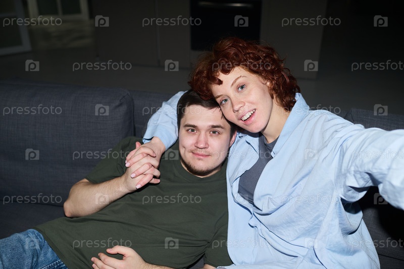 Портрет молодой женщины и молодого человека, которые вместе делают селфи