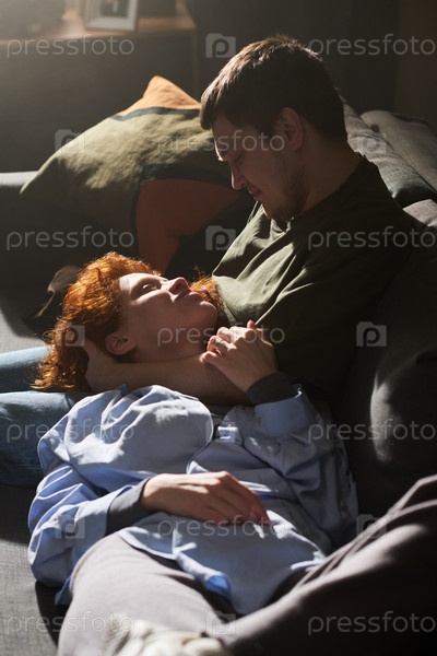 Молодая женщина, лежащая на диване и обнимающая молодого человека