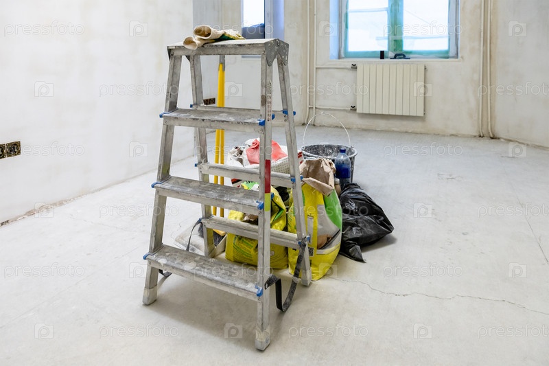 В бетонном помещении с инструментами грубой отделки
