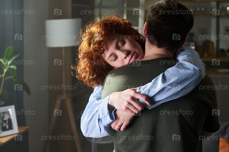 Молодая взрослая женщина обнимает молодого взрослого мужчину в помещении, показывая любовь