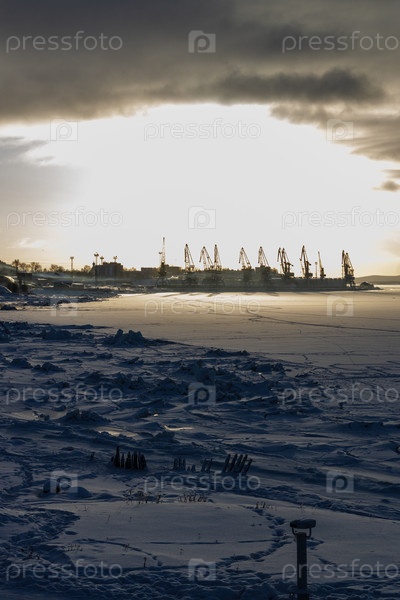 Снежный берег моря и портовый кран в городе Кандалакша