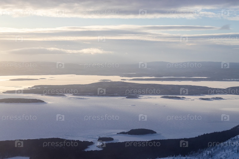 Вид сверху острова в заливе Кандалакша в тумане