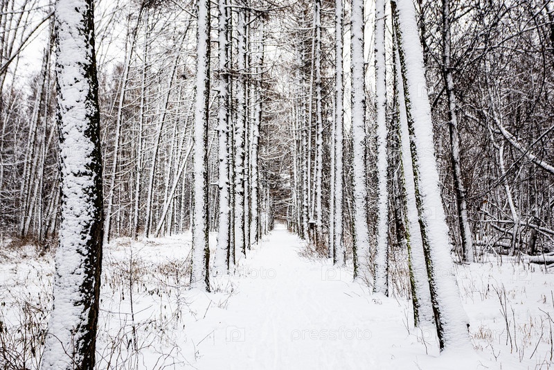 Покрытые снегом ларчаные деревья вдоль заснеженной аллеи в парке