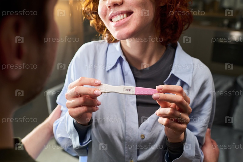 Молодая взрослая женщина улыбается, показывая положительный тест на беременность
