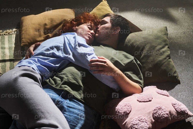 Молодая пара обнимается, лежа вместе на полу в помещении