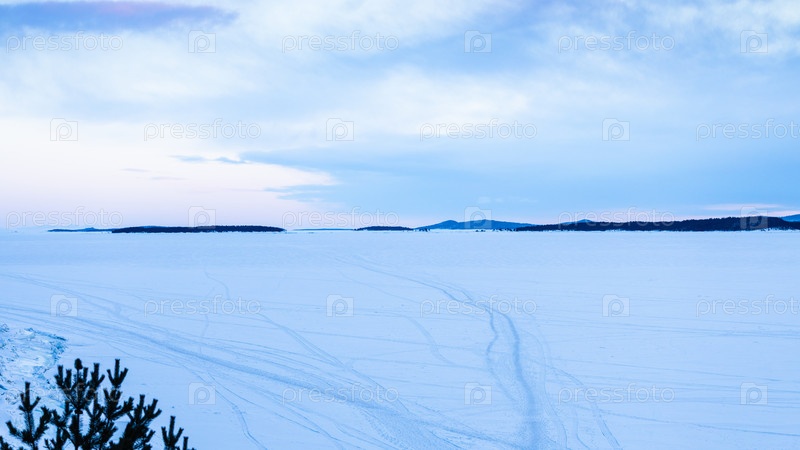 Панорамный вид замороженного залива Кандалакша в сумерках