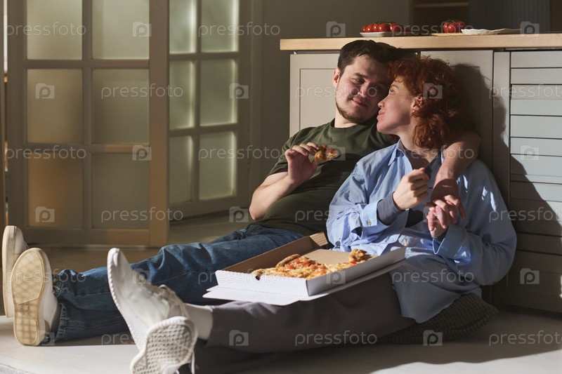 Молодой мужчина и молодая женщина едят пиццу и расслабляются вместе