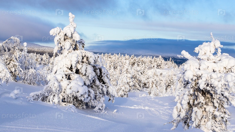 Панорамный вид снежных деревьев на холме, Кандалакша