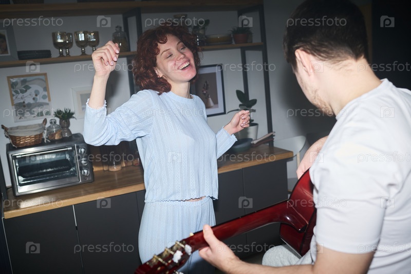 Молодая женщина танцует, а молодой человек играет на гитаре в помещении