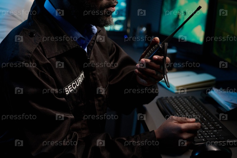 Чернокожий человек следит за камерами видеонаблюдения при использовании валки-таки