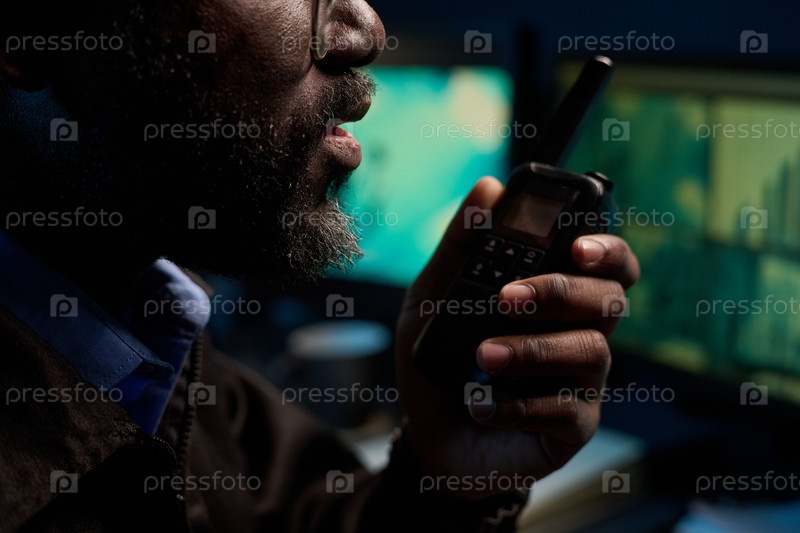 Молодой чернокожий мужчина разговаривает на прослушке в контрольной комнате