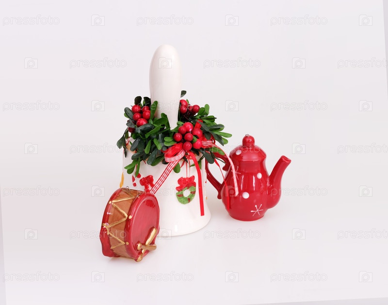 Рождественская композиция с красным керамическим украшением Сhristmas и керамический колокол, изолированный на белом фоне