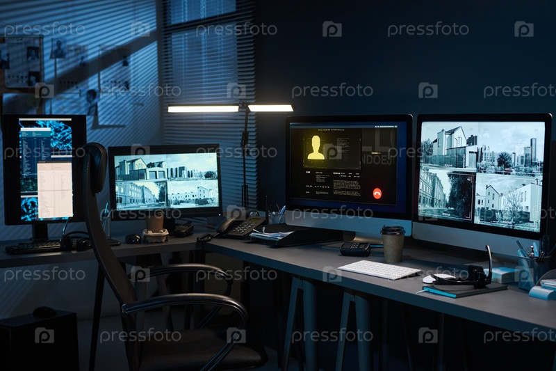 Modern Surveillance Office Monitoring Security Footage on Multiple Screens (Современный офис по наблюдению за записями безопасности на нескольких экранах)