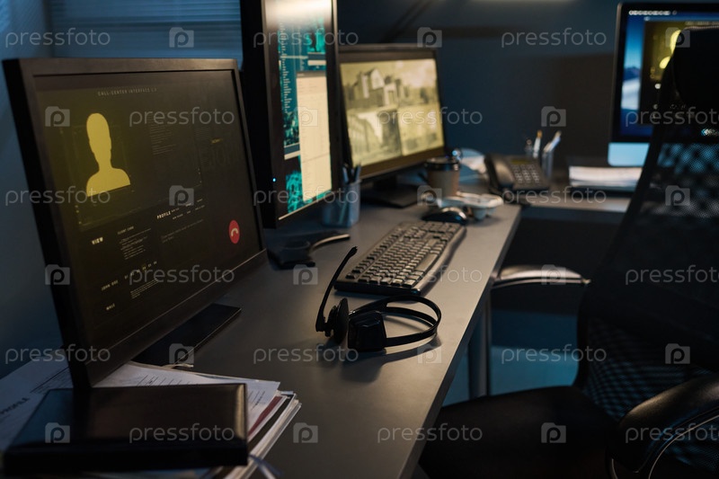Офисный стол с компьютерными мониторами, отображающим современный интерфейс безопасности