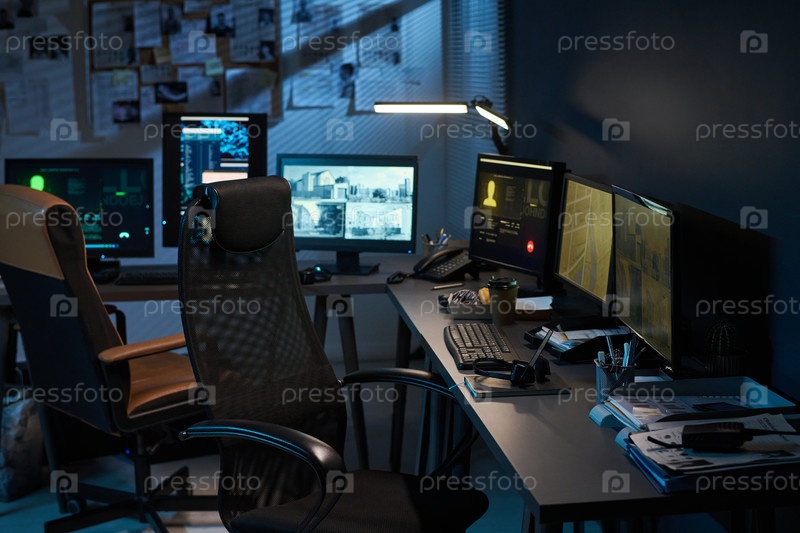 Пустой офис наблюдения показывает несколько компьютерных мониторов отображает видеоматериалы безопасности