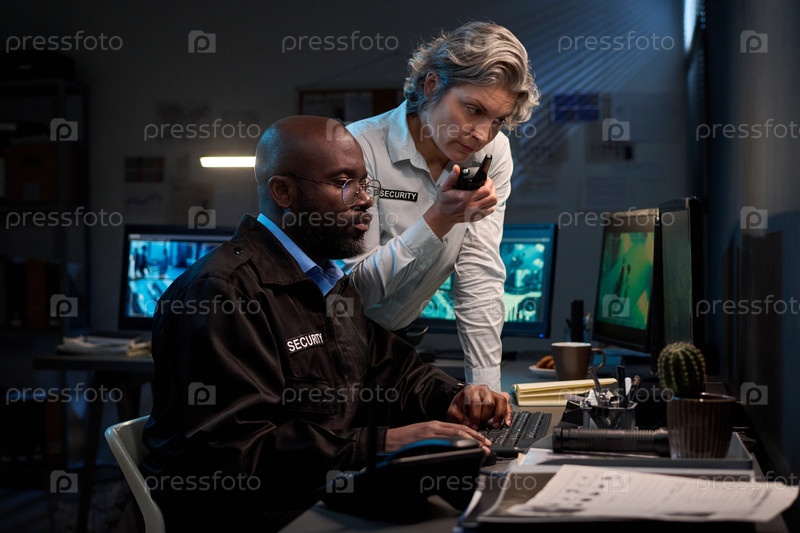 Чернокожий мужчина и белая женщина вместе следят за записями безопасности