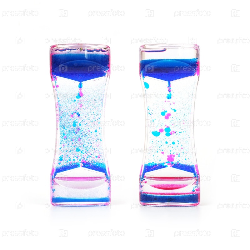 Водные часы (клепсидра) с цветными каплями, изолированными на белом фоне