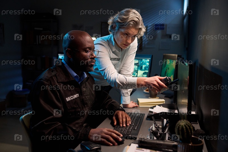 Кавказская женщина учит чернокожего человека просматривать данные наблюдения
