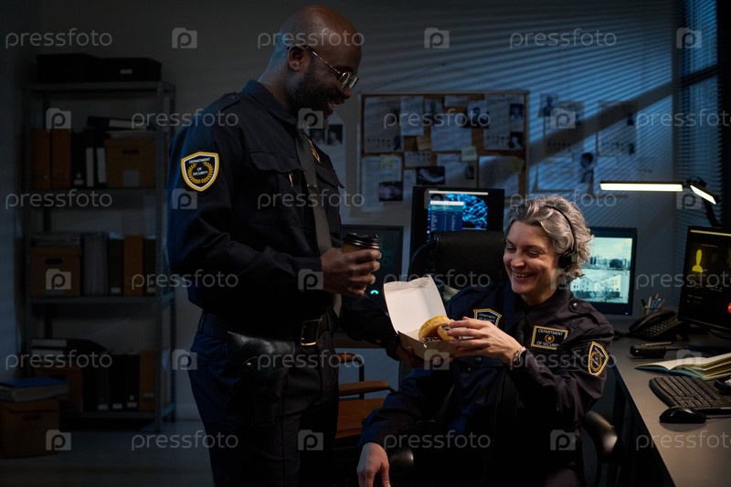 Молодой чернокожий мужчина дарит кофе белой женщине-полицейскому, улыбающемуся