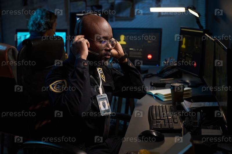 Чернокожий мужчина работает охранником в контрольной комнате наблюдения