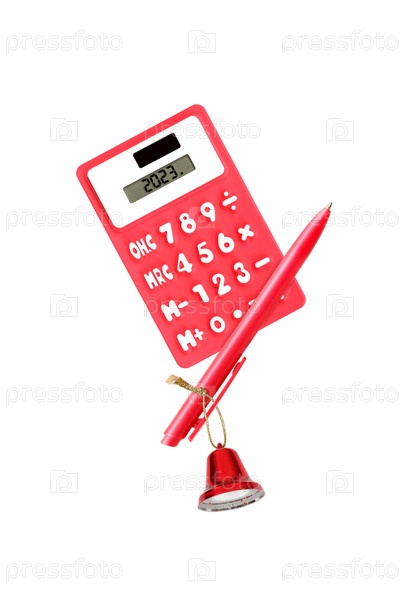 Рождественская композиция с красным калькулятором, шариковым шаром и колоколами изолированными на белом фоне