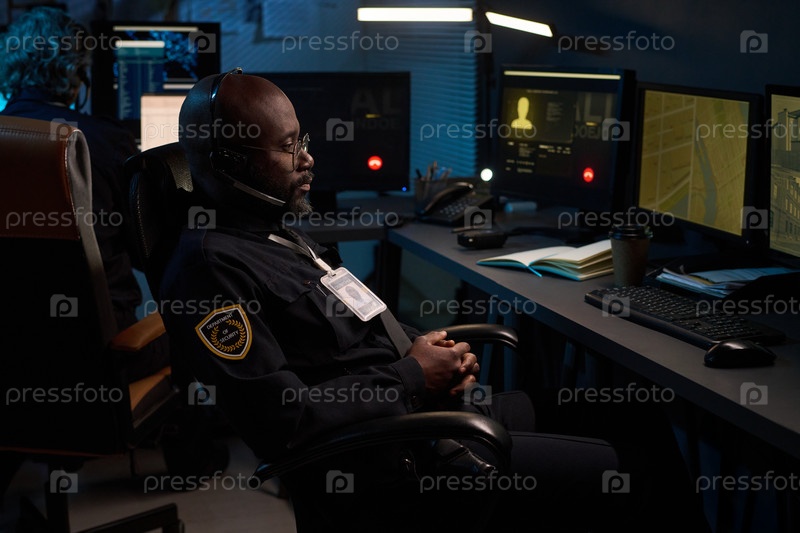 Молодой чернокожий мужчина следит за записями безопасности в комнате управления ночью