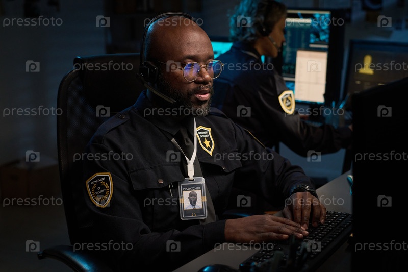 Черный человек следит за камерами безопасности в комнате управления ночью