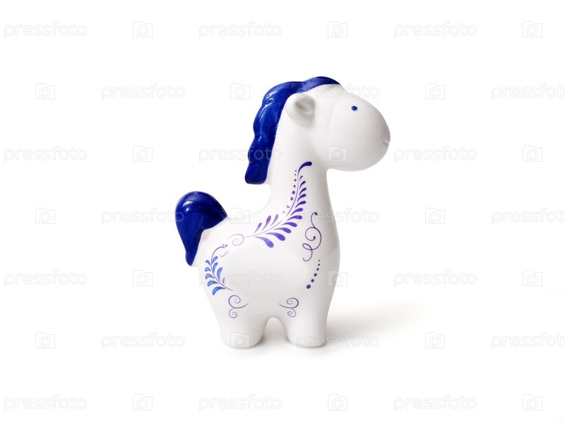 Традиционная керамическая конская статуэтка с белой глазурью и синими декоративными мотивами, изолированной на белом фоне, готовая к вырезке