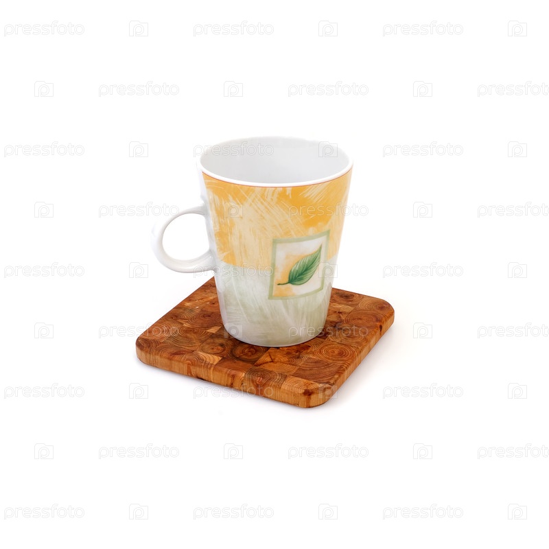 Порцелановый стакан на яблоневой доске на белом фоне