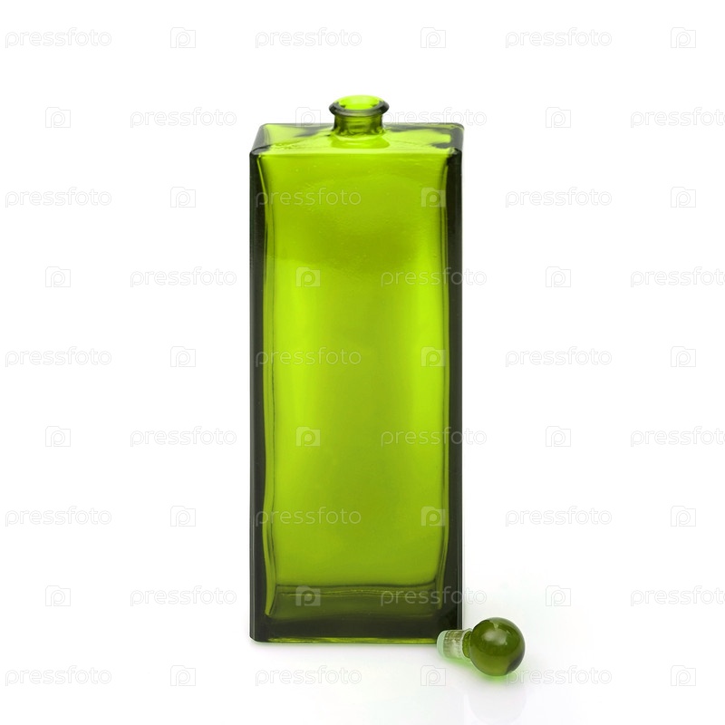 Layout зеленая бутылка с парфюмом изолирована на белом фоне