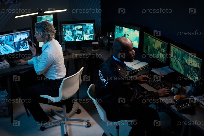 Кавказская женщина средних лет и чернокожий мужчина наблюдают за камерами видеонаблюдения ночью