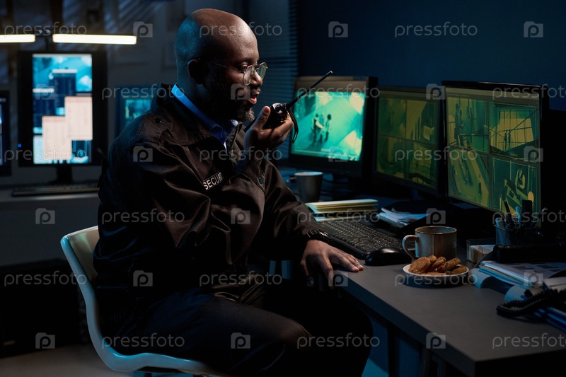Чернокожий мужчина следит за камерами видеонаблюдения во время разговора в прослушивалку