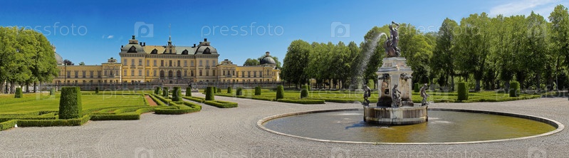 Летняя панорама дворца Drottningholm из французского барокко сада с фонтаном Геркулеса, Стокгольм, Швеция