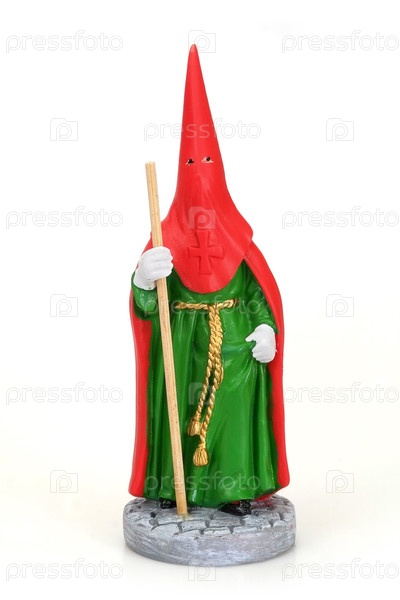 Сувенирная испанская статуэтка "Брат религиозного братства в сотанке с посохом" изолирована на белом фоне