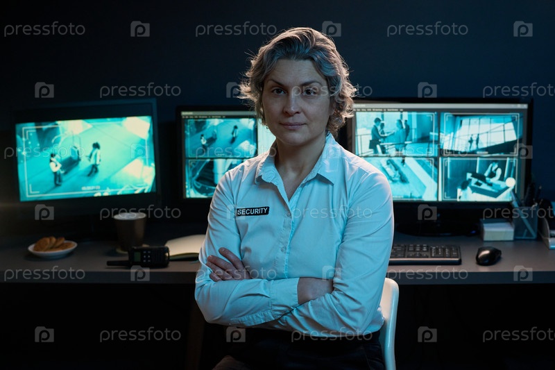 Портрет белокожей женщины среднего возраста, отслеживающей камеры безопасности на рабочем месте