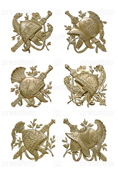 Набор золотых декоративных элементов интерьера с изображением шлема из древнегреческого мифа.Элемент выделен на белом фоне